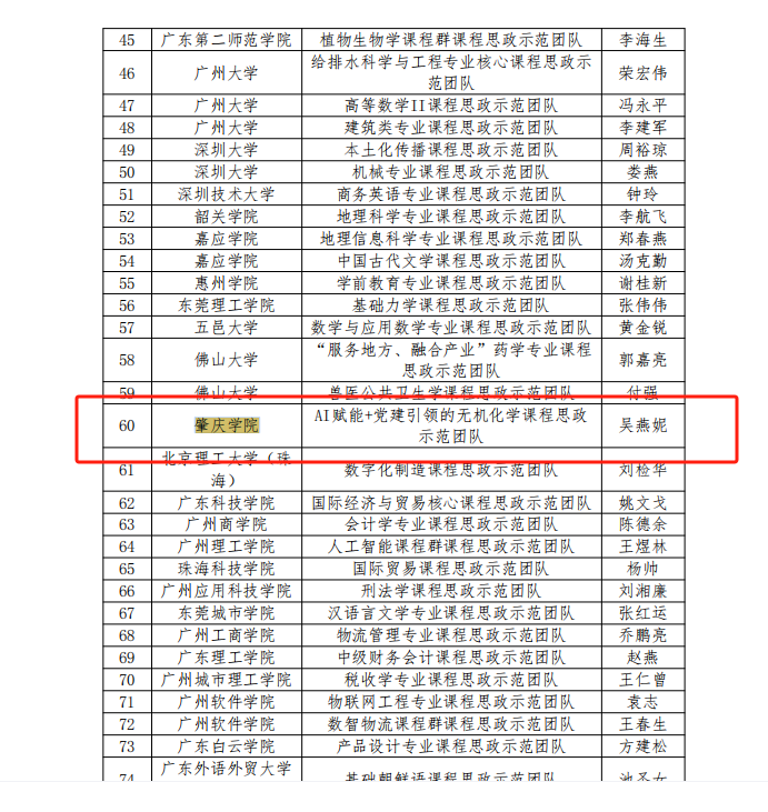 近日,广东省教育厅公布了2024年度本科高校课程思政改革示范项目认定名单,304永利集团吴燕妮教授带领的“AI赋能+党建引领的无机化学课程思政示范团队”在课程思政示范团队项目申报中脱颖而出,成功立项。