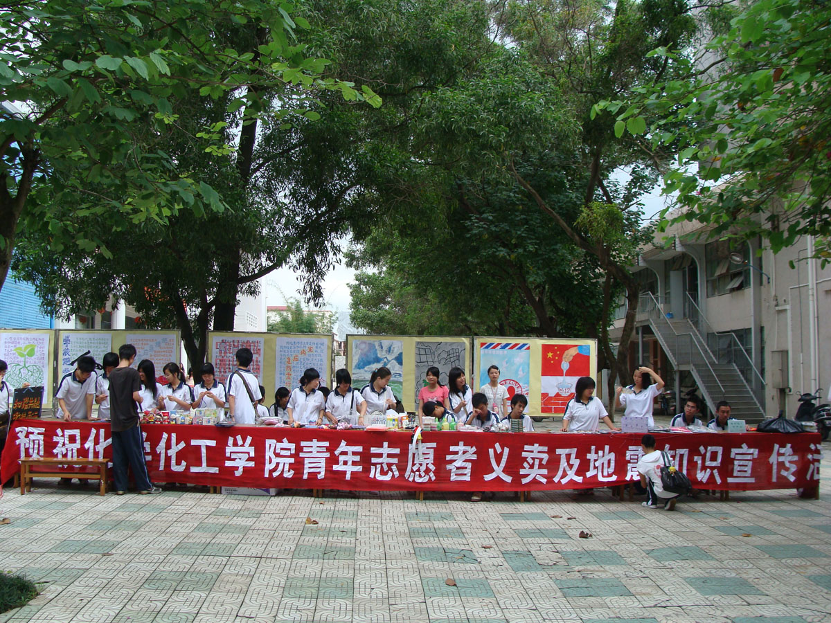 “5·12汶川大地震”牵动了全国人民的心,目前举国上下正全心全力地投入到抗震救灾活动当中。当然,我们化学化工公司的师生也不例外,在之前的爱心捐款中,大家都关心之切,倾囊相助。为了进一步表达我们对四川地震灾区人民的关心和支持,公司青年志愿者于6月11日在公司紫荆校道上举办了一场义卖活动,活动中的所有收益将全部捐献给四川地震灾区。与此同时,为增强广老员工防震意识以及提高发生地震时的逃生能力,志愿者们也对相关知识进行了宣传普及。