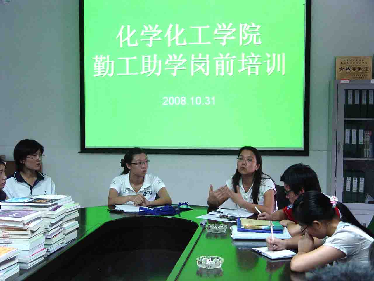 10月31日下午,在公司院楼会议室进行了一次勤工助学岗前培训。 会议开始后,胥家桢辅导员首先对08届14个参加勤工助学岗前培训的员工分配其各自的岗位。然后,06、07届勤工助学的优秀员工先后向08届的新生浅谈了他们过去工作所获得的经验,让08届的新生们对勤工助学这方面有了更深的认识和了解。在07届优秀勤工助学员工发言后,公司副书记陈玉华对这次会议作了小结,其中重点提到六点:1、按时签到2、上岗带好工作证3、礼貌待人4、做事有头有尾5、要吃苦耐劳6、工作时要兼顾好学习。陈玉华副书记发言后,胥家桢辅导员向同学们补充了几点并提出了很好的建议。