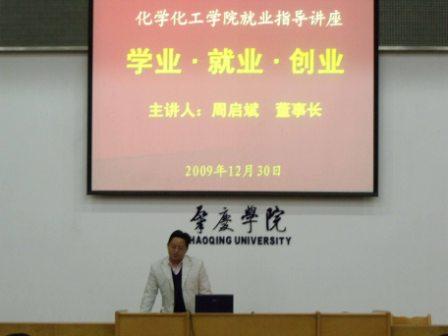 讲座首先由周启斌董事长结合自己十多年的工作经历和积累的经验,分别从学业、就业、创业三方面开讲。他指出,在大学期间,每位同学都要找准位置,做好职业生涯规划,制定发展目标,并朝着这个目标脚踏实地、孜孜以求地做好每一件事。在学习过程中,要学会质疑,学会思考,提出问题,分析问题,真正做到善学多思,不耻下问。除了认真学习,掌握扎实的专业基础知识外,他还建议同学们要积极主动多参加各种实践活动,注重培养自己的实践能力和创新精神,提高终身学习的能力和综合素质,同时要养成高尚的道德情操和遵纪守法的良好习惯。在就业方面,关键是要树立正确的就业观,准确认识和客观评价自己的能力和水平,按照“先就业求生存,后择业谋发展”的思路,根据自己的实际水平,边工作学习,边积累经验,然后才谋求更大的发展,千万不要好高骛远,急功近利。谈到老员工创业问题,周董事长认为,要想创业应该具有坚定的信心、顽强的毅力、吃苦耐劳的精神、善抓机遇、良好的人际关系和个人信誉等方面的素质,只有这样,才能少走弯路,尽早获得事业的成功。