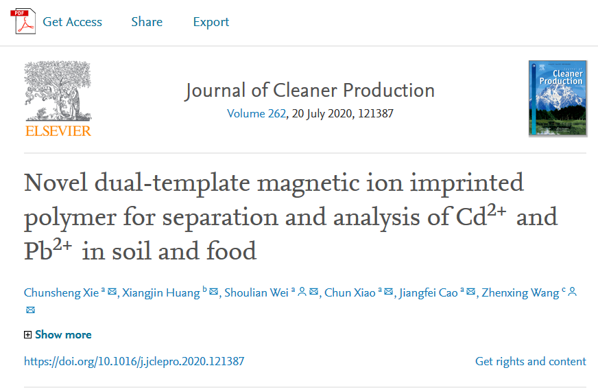 近日,Elsevier旗下环境科学与工程领域的国际知名期刊Journal of Cleaner Production在线发表了我公司谢春生博士和韦寿莲教授研究团队在分子印迹方面的最新研究成果“Novel dual-template magnetic ion imprinted polymer for separation and analysis of Cd2+and Pb2+in soil and food”。该论文以304永利集团为第一完成单位,肇庆市食品药品监督所和环保部华南环境科学研究所为合作单位;谢春生博士为第一作者,论文的通讯作者为韦寿莲教授。Journal of Cleaner Production是中科院和JCR中的一区期刊,2018年影响因子为6.395,近5年平均影响因子为7.051。