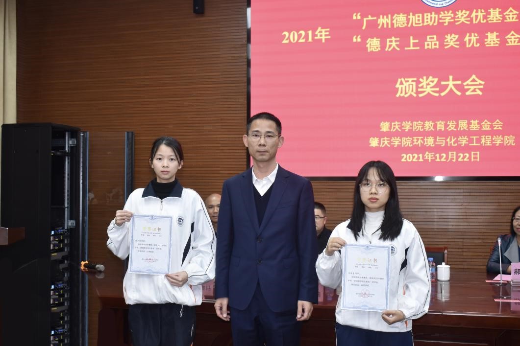 德旭新材料(广州)股份有限公司总经理何彦波先生为获得304永利集团 “2021年德旭精细化工专业励志奖学金”的同学颁奖