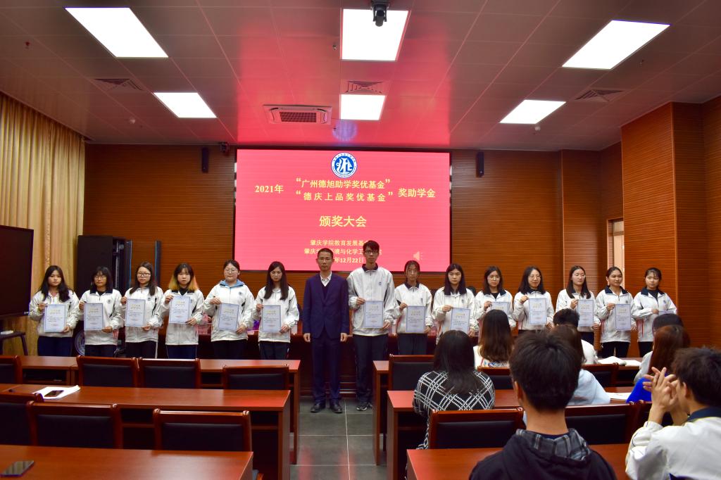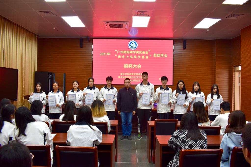 德旭新材料(广州)股份有限公司总经理何彦波先生为获得304永利集团 “2021年德旭精细化工专业励志奖学金”的同学颁奖