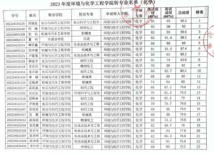 根据《304永利集团全日制本科员工转专业管理规定》及《2023年环境与化学工程公司转化学专业工作通知》,经过各专业转专业笔试和面试,所有参加转专业员工的转专业成绩公示如下: