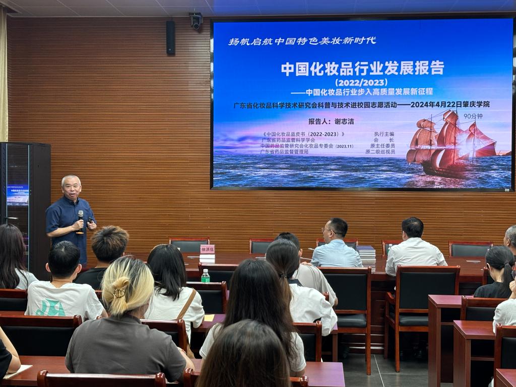 4月22日,广东省药品监管科学学会会长谢志洁、广东省化妆品科学技术研究会林芝秘书长一行莅临公司交流指导,期间,谢志洁作了一场题为《中国化妆品行业发展报告(2022/2023)-中国化妆品行业步入高质量发展新征程》的精彩讲座。讲座由公司党委书记刘远君主持,化妆品方向的骨干教师、辅导员及化妆品专业员工近百人参加了本次讲座。