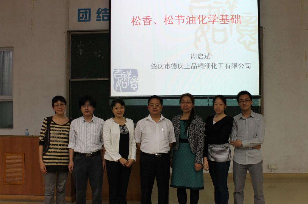 4月20日下午,肇庆市德庆上品精细化工有限公司董事长周启斌应公司邀请,在第二教学楼707课室为公司师生做了一场题为“松香、松节油及其应用”的学术讲座,讲座现场座无虚席。郝向英副经理出席会议。