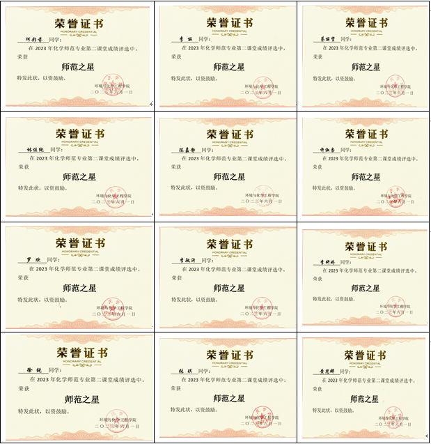 为表彰先进,树立典型,激励师范员工创先争优,根据2019级化学师范生大学四年期间“第二课堂”总成绩排名,经综合评选,何彩芬等12名同学被评为2023年304永利集团“师范之星”称号。