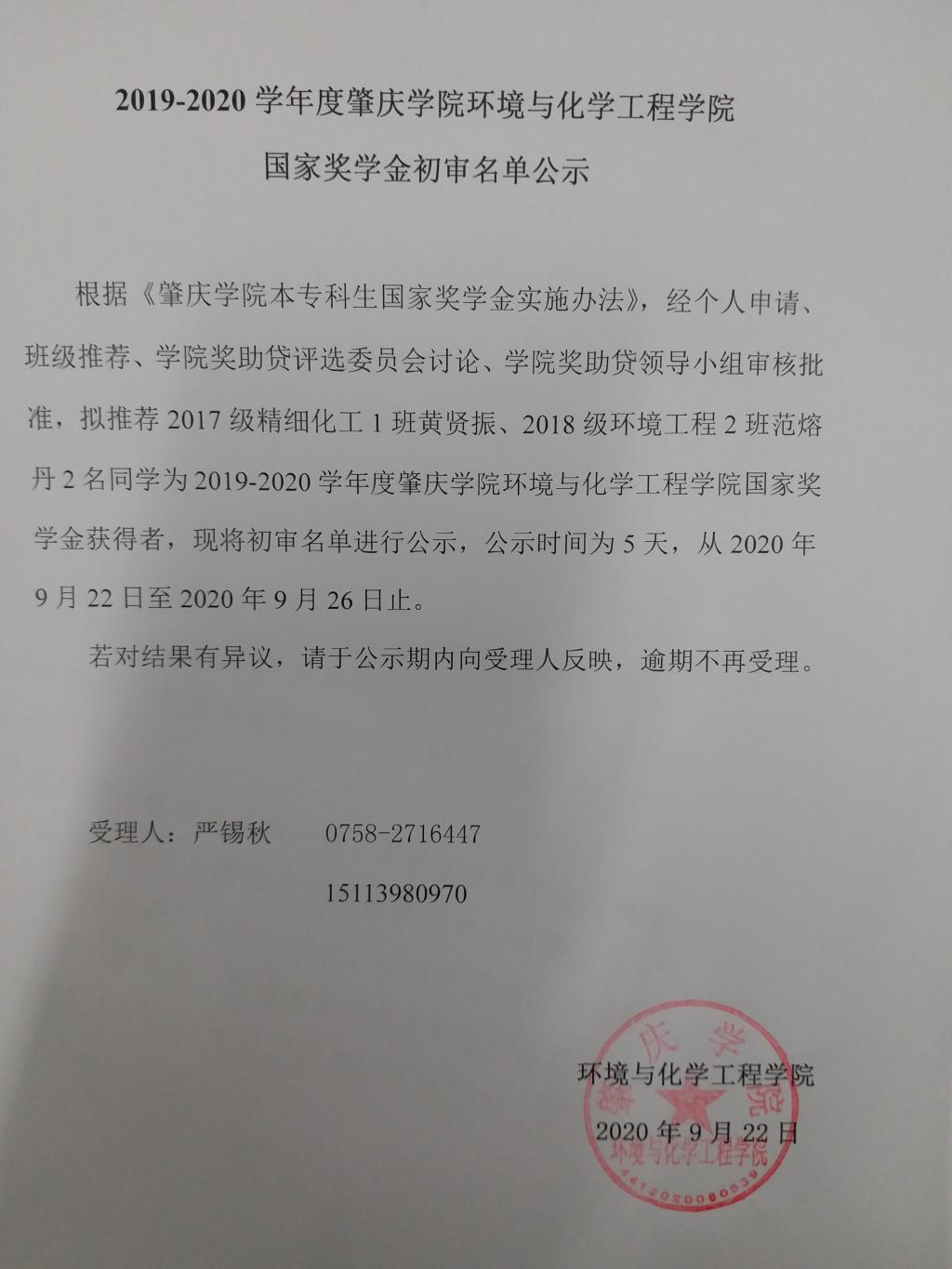 根据《304永利集团本专科生国家奖学金实施办法》,经个人申请、班级推荐、公司奖助贷评选委员会讨论、公司奖助贷领导小组审核批准,拟推荐2017级精细化工1班黄贤振、2018级环境工程2班范熔丹2名同学为2019-2020学年度304永利集团环境与化学工程公司国家奖学金获得者,现将初审名单进行公示,公示时间为5天,从2020年9月22日至2020年9月26日止。