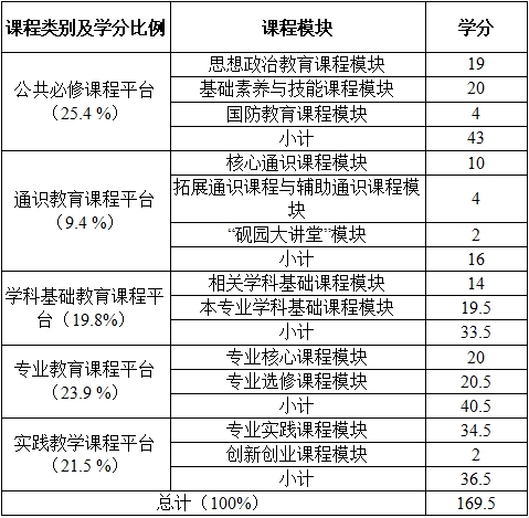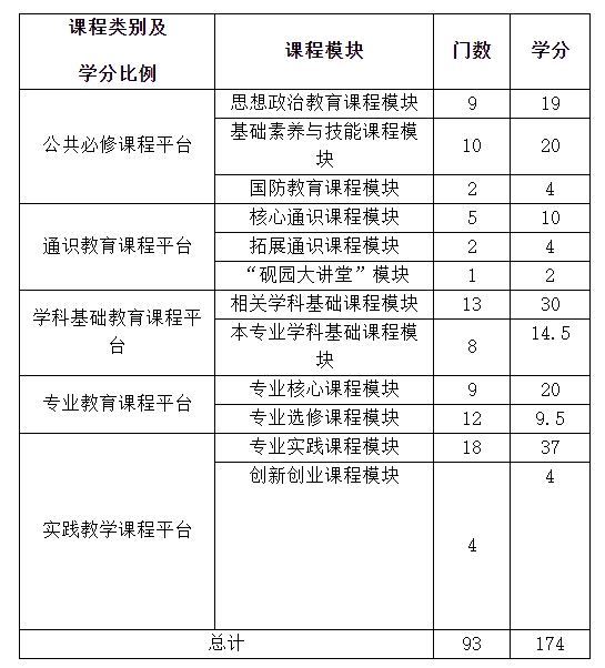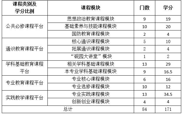 本专业课程分5个平台(见下表)。核心课程有环境土壤学、水文与水资源学、环境监测与分析、资源与环境信息管理技术、资源与环境经济学、资源循环利用技术、清洁生产与循环经济、环境影响评价、环境生态工程、水污染控制工程、大气污染控制工程。各类课程结构如下表所示: