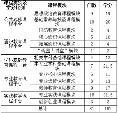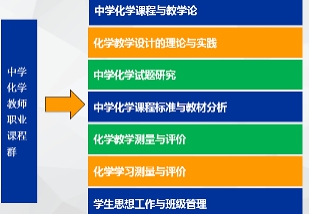 本专业课程分5个平台(见下表)。核心课程有无机化学及实验、有机化学及实验、物理化学及实验、分析化学及实验、化工基础及实验;教育基础理论等教师教育课程模块;中学化学教师职业课程群模块(见下图)。各类课程结构如下表所示: