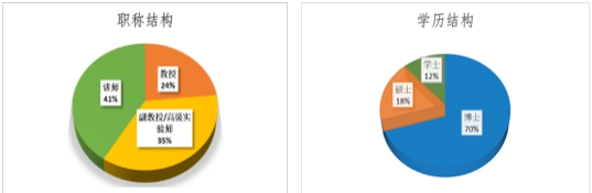 化学专业具备一支学缘结构合理、团队力量雄厚的教师队伍,现有专任教师17人,其中广东省“千百十”人才工程省级培养对象1人、校级培养对象10人;广东省级教学名师1人、校级教学名师4人;校级教学质量十佳教师10人次,校级学术带头人3人、校级优秀教学骨干5人。职称结构、学历结构如下图所示: